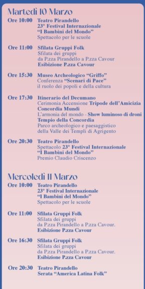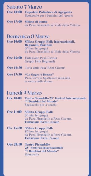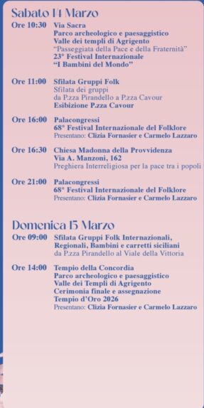 7 Marzo 202678° Mandorlo in Fiore, 68° Festival Internazionale del Folklore, 23° Festival Internazionale “I Bambini del Mondo”, Agrigento 7/ 15 marzo