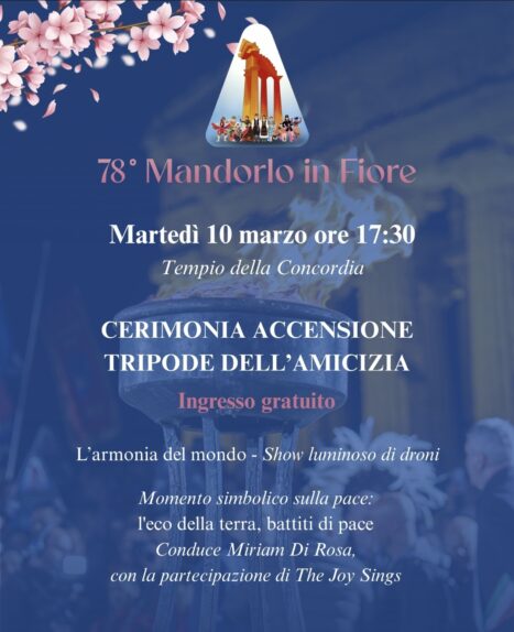 9 Marzo 2026Ad Agrigento, nell’ambito della 78ª edizione del Mandorlo in Fiore, domani pomeriggio, a partire dalle ore 17:30, davanti al Tempio della Concordia, si svolgerà la cerimonia di accensione del “Tripode dell’Amicizia”, momento simbolico e carico di emozione della kermesse, che suggella la pace e la fratellanza tra i popoli.